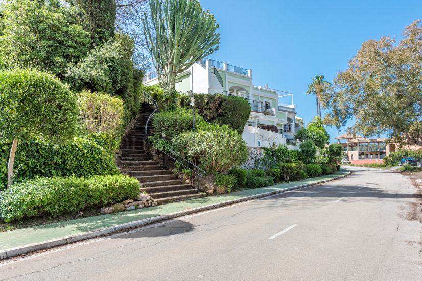 In the sought-after Aloha Pueblo development, residential Nueva Andalucía, 10 mins from Puerto Banus and beaches. It offers spectacular views, a heated pool, well-maintained walkways and gardens, boutique restaurants, and round-the-clock security.