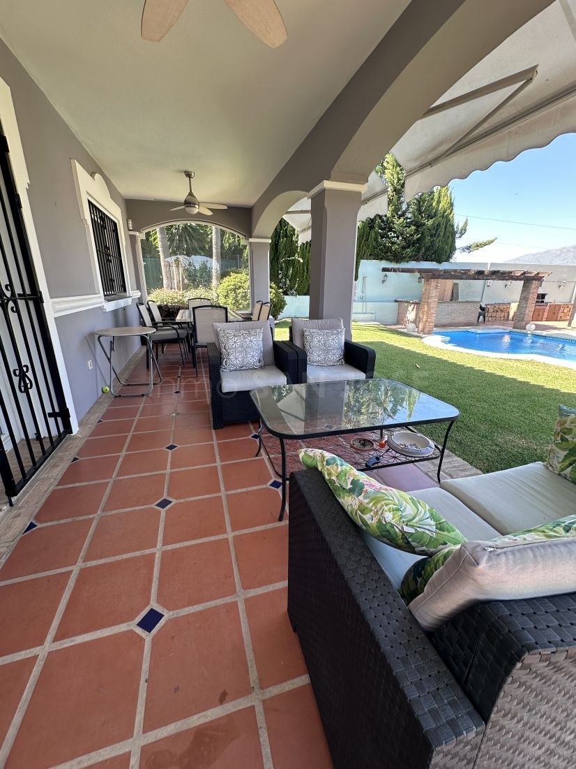 Villa en venta en Estepona con 3 dormitorios, 2 baños, 1 baño en suite, 1 aseo y con orientación sur/este, con piscina privada, garaje privado (2 plazas) y jardín privado. Respecto a las dimensiones, la propiedad presenta 289 m² construidos, 754 m² de parcela, 210 m² en interior y 79 m² de terraza. Tiene las siguientes características próxima a la montaña, servicios cercanos, aire acondicionado, cocina totalmente equipada, trastero, chimenea, tv por satélite, almacén, alarma, entrada de seguridad, cristal doble, videoportero, comedor, barbacoa, aseo para invitados, terraza privada, salón, suelos de parquet, vistas a la montaña, lavadero, internet – wi-fi, terraza cubierta, armarios empotrados, vistas al jardín, vistas a la piscina, bodega, sin amueblar, cerca del golf, terraza descubierta, puertas de cristal, comedor independiente, balcón, buen estado, tiendas cerca, colegios cerca, aire acondicionado individual, radiadores eléctricos y vistas parciales al mar.
