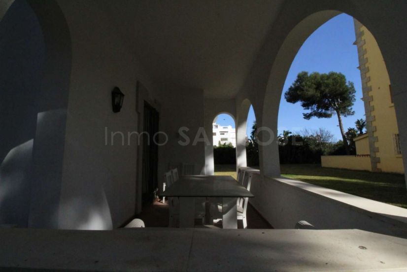 Es un amplio apartamento en Planta baja, Reformado Recientemente es de 3 dormitorios y 3 baños con varias terrazas con acceso a los cuidados jardines y gran luminosidad, la cocina americana integrada en el salón con electrodomesticos de Alta Gama incluso tiene el detalle de la vitrocerámica es de color blanco. Luego tiene 2 dormitorios principales con baños en suite respectivamente y uno de ellos orientado al sur tiene salida a una 2da terraza. Estos 2 baños dan al exterior por lo que tienen gran luminosidad y ventilación. El 3r dormitorio en la zona de la entrada tiene a su lado otro baño con ducha amplio y para invitados. Este 3er dormitorio tiene salida a una 3ª y gran terraza con orientación al oeste y sol de tarde. Esta terraza oeste, comunicada con la terraza principal de salida desde el salón, y esta parte tiene zona porticada preciosa.