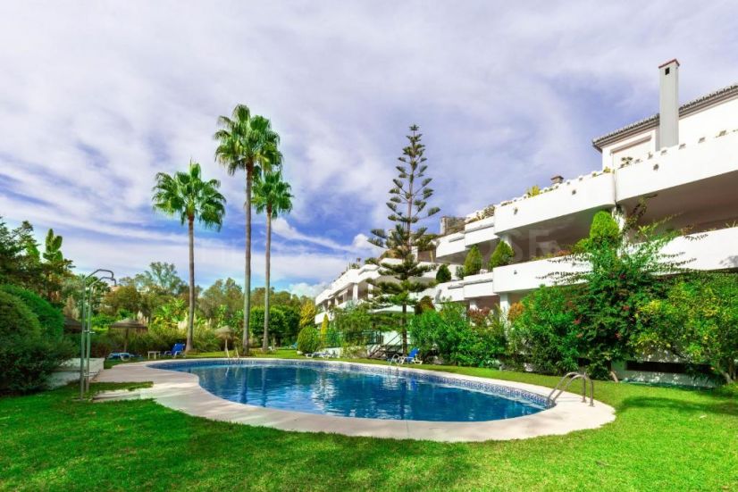 Este apartamento recientemente renovado cuenta con un amplio salón-comedor de planta abierta, bañado por luz natural, que se abre a una terraza privada con serenas vistas a los jardines y la piscina.